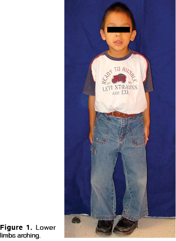 Extra-oral exploration revealed a male patient with clinical characteristics of base diagnosis emitted: bulging frontal bone, lower limb bow and genu varum (Figures 1 and 2).