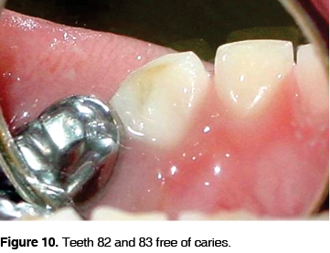 At the first appointment, a pulpotomy was performed in tooth number 84 and a pupectomy was conducted in tooth number 85. This was decided because, at the moment of gaining access, a necrotic distal conduct was found. At a later time chrome-steel crowns were placed on both molars. At the second appointment, the pulpectomy of tooth number 54 was performed, due to the presence of a fistula with egress of purulent material. The pulpotomy of tooth number 55 was performed with chrome steel crown. At the third appointment, an increase in volume was observed at the level of teeth 83 and 82. This was caused by periapical abscesses (Figures 9 and 10); it was then decided to perform pulpectomies of those teeth. Glass ionomer and resin restorations were then placed.