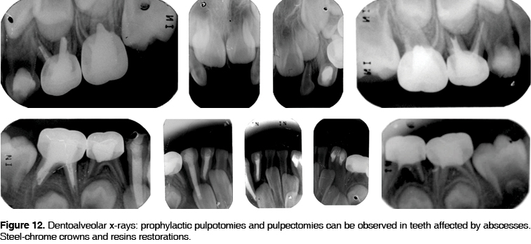 2. In cases when the patient presents abscesses in at least two teeth, according to experience gained at the Instituto Nacional de Pediatría (National Pediatrics Institute) it is recommended to perform pulpectomies in teeth presenting abscesses and prophylactic pulpotomies in the remaining as yet unaffected teeth. This can be achieved by placing chrome-steel crowns in molars and resin restorations in anterior teeth.