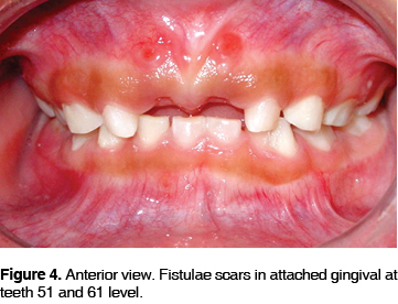 Intra-oral examination revealed upper arch with caries-free, incomplete primary dentition, absence of teeth 51 and 61 due to extractions performed by a private dentist, scarring of fistulae at attached gingival level of those same teeth. The mother informed of multiple appearance of abscesses, which was the reason behind the extractions. Nevertheless the mother reported no history of trauma or caries (Figures 3 and 4).