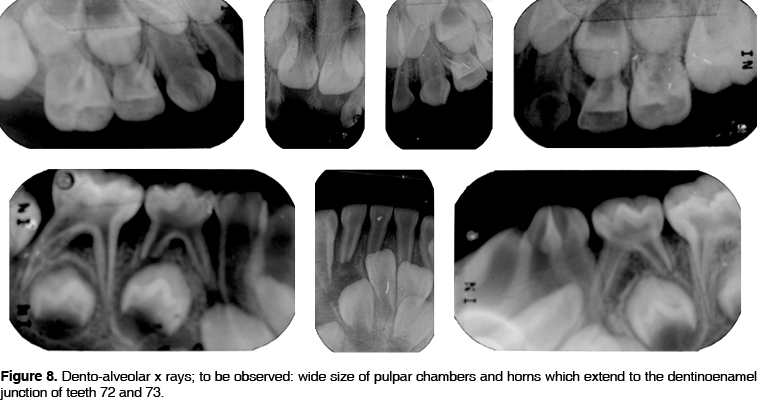 Besides mineralization alterations, other reported characteristics are: normal but thin enamel, and especially enlarged pulp chambers as well as very high placed pulp horns extending until the dentin-enamel junction which are clearly visible in X rays.