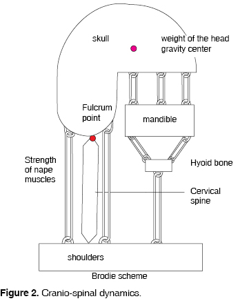 The cervical-skull system is an intrinsic component of the body's upper quadrant. It is composed of head, neck and scapular girdle. It is formed by skeletal structures (skull and cervical vertebrae) connected by articulations (atlanto-occipital, atlanto-axial and vertebral) muscle attachments, ligaments, aponeurosis, innervations and blood supply.6 The dynamics of this system consist in preserving the balance of the skull on the spine. This is achieved when the eyes are horizontally fixed.In this position, the occlusal plane is horizontal, which is also the case of the auricular-nasal plane, which passes through the upper border of the external auditory conduct and the anterior nasal spine. During the biomechanical process of the skull-cervical dynamics, a system of levers is formed: