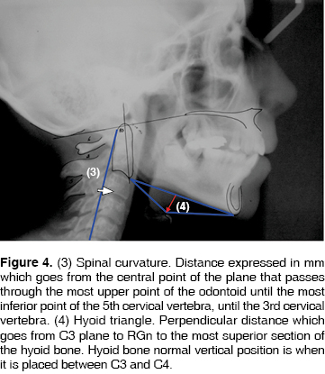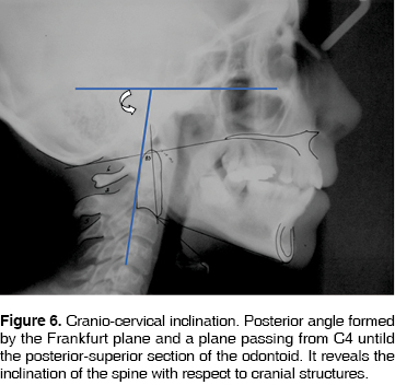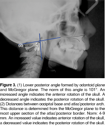 Cephalometric tracings were performed on the pre- and post-surgical lateral skull X-rays. For this purpose, a number 0.02 stylograph was used on an acetate tracing sheet. Performed cephalometric tracings were angles SNA, SNB, ANB as determined by planes Nasion-point A and Nasion-point B. Vertical facial dimension was also millimetrically assessed by considering the distance of the Frankfort plane and the chin point projected over a vertical line perpendicular to the Frankfort plane. With the help of cephalometric tracings described by Dr Mariano Rocabado the following measurements were assessed in pre- and post-surgical lateral skull X-rays: skull rotation (skull-odontoid angle), distance from occipital base to the atlas posterior arch (Figure 3), cervical curvature, hyoid triangle (Figure 4), cranio-cervical angle (Figure 5) and cervical inclination (Figure 6).