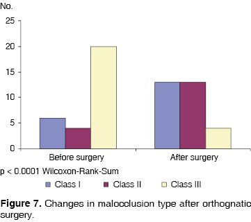 According to type frequency of maxillary-mandibular skeletal relationship after orthognathic surgery, the following could be observed: 43.33% presented class I, 44.43% presented class II and 13.33% exhibited class III (Figure 7).