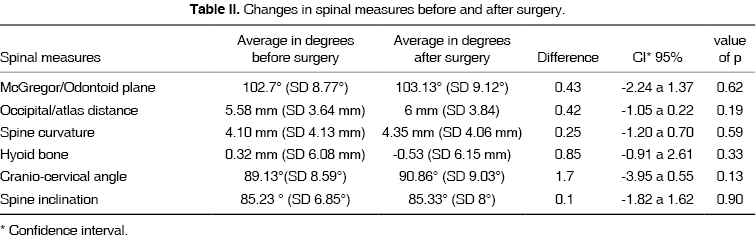 There were no significant changes (in millimeters) in the vertical position of the hyoid bone or in the cervical curvature, neither were there changes in the degree average of the cranio-cervical angle and the inclination of the spine from the pre-surgery to the post-surgery period p = 0.33, p = 0.59, p = 0.13 and p = 0.90.