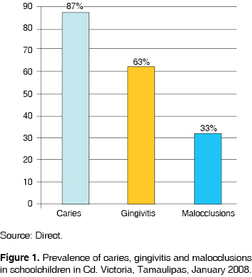 In the last four years, caries prevalence in Mexican population has decreased. This could be due to government programs such as ''Semana Nacional de Salud Bucal'' (National Week for Oral Health) as well as access to public health services for a greater number of subjects.2 Nevertheless 61% of all Mexican children over 6 years of age suffer caries.3 In Mexico City, Moreno Altamirano et al reported in 2001 high prevalence (95%) of caries in school-age children with primary dentition. Caries prevalence in children with permanent dentition was 33%.4 In 2005, In Navolato, Sinaloa, a report was made confirming that caries was found in 82% of school-age children with primary dentition, and 90% of children with permanent dentition.5 Concurrently, Zelocuatecatl6 found presence of a relationship between number of decayed teeth and corporal mass index. A year later, Juarez et al when assessing pre-school children, reported caries presence of 68%. The proportion was divided as follows: 60% with normal weight, 19% with low weight, and 22% with overweight and obesity.7