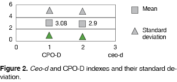 Ceo-d index was 2.97 ± 2.1 and CPO-D was 3.08 ± 2.18 (Figure 2).
