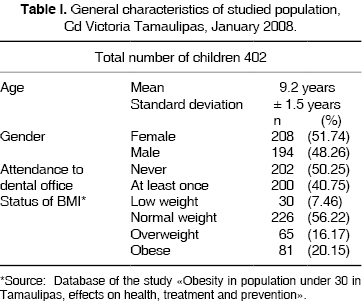A comparative, cross-sectional study was conducted in 402 school-age children between 7 and 12 years of age analyzing cases and control groups. Children were randomly selected from the database of the study ''Obesity in under 30 population in the state of Tamaulipas: effects on health, treatment and prevention strategies'' conducted by the Tamaulipas Children's Hospital. The aforementioned project is still being carried out with financing of Conacyt Fund, Tamaulipas Government, code tamps 2005c08-27. Subjects of the present study were school children from three public primary schools (348 children), and one private school (54 children). Body composition measurements were provided for these children; children suffered no systemic diseases and parent or tutor authorization was previously granted. The size of the sample was calculated using the package SSIZE version 2.0, with alpha 5 and power 90. All children were subjected to oral examination which was conducted by 7 stomatologists. These professionals were trained to standardize measurement criteria. Oral examinations were conducted in a specially adapted classroom of each participating school. Activities were distributed into two work teams as follows: the first team was composed of three stomatologists which were responsible for the oral examination. The second team was in charge of recording in the statistics, capture tab results of the aforementioned exam as well as data pertaining to identification of each child. For oral inspection, the following were used: number 5 oral mirrors, dental explorers, tongue depressors, disposable gloves, masks and artificial light.
