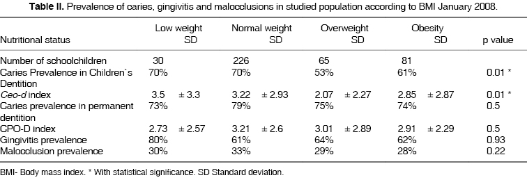 Aim: Assessment of caries, gingivitis and malocclusion prevalence in school-age children in the city of Ciudad Victoria, Tamaulipas, Mexico and determination of its relationship with their nutritional status. Methodology: A comparative, cross-sectional study was conducted on 402 school-age children (ages 7-12 years). These children could exhibit measurement of body composition. Children were randomly selected from the study list of ''Obesity in Tamaulipas' under 30 population, effects on health, treatment and prevention'' conducted in this hospital. All subjects provided written consent, thereafter, oral examination was performed in order to determine, according to WHO parameters, presence of dental caries, gingivitis and malocclusions. Version 9.0 of STRATA program was used to conduct statistical analysis. Results: 50% of school age children had never attended a dental office. 32.2% were overweight or obese. Caries prevalence was 87%, gingivitis was present in 63% of all cases, and malocclusions were present in 33% of patients. Ceo-d index was 2.97 and CPO-D was 3.08. Multivariate analysis revealed relationship between the ceo-d index with age (p = 0.00), with overweigh and obesity and with malocclusions (p = 0.016) as well as relationship between age and gingivitis (p = 0.01) and age and malocclusion (p = 0.042). Conclusions: Malocclusion and caries prevalence resulted similar to that observed in other studies performed in Mexico. Nevertheless, gingivitis was more frequent. In our casuistry; the most significant relationship was that found between ceo-d index with overweight and obesity.
