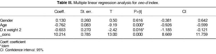 In a similar manner, for each change in age, ceo-d index modifies in an average of -0762 (Table III) allowing adjustments for weight status and gender.