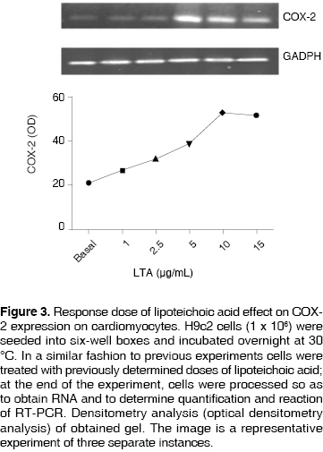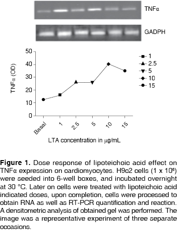 The aim of the present study was to characterize TNFα, IL-1 and COX-2 on H9c2 treated with LTA. With this purpose in mind, we achieved a H9c2 cells cellular culture where we conducted experiments of the type dose-response so as to characterize gene induction through RT-PCR.