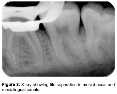 In recent years, in the field of endodontics, the use of rotary nickel-titanium (NiTi) instruments has gained great popularity. NiTi instruments have been developed to simplify and improve the effectiveness of endodontic shaping procedures. Studies have reported the ability of rotary NiTi files to minimize procedural errors such as ledge and transportation, and create well-centered smooth canal preparations.1,2 However, a major concern with the use of rotary NiTi during root canal shaping is file breakage. In most cases file separation often results from incorrect use or overuse of an endodontic instrument.3 Although there is a perception that rotary NiTi instruments might unexpectedly fracture, there is evidence indicating that fractures involve many factors. The most important seems to be the clinician's conscious decision to use instruments for a limited number of times or until defects becomes evident.4 In scientific literature, there are descriptions of a number of treatment protocols for this procedural accident during cleaning and shaping of the root canal system, with varying degrees of success; among them we can count the following: the fractured instrument should be left in the canal and tissues in a coronary location with respect to the object should be treated according to standard endodontic procedures; the object should be bypassed and incorporated into the final root canal filling; surgical techniques for removal the object itself or the entire portion of the root with the object; introduction of instruments and techniques for retrieval within the tooth of the obstructing object.5 However, even in cases where file removal is successful, complications in the removal procedure might result in loss of considerable tooth structure and clinical complications such as root perforation.6,7 Thus it is very important to assess the potential difficulty in removal attempts of instruments' fragments and a possible adverse prognosis effect of this procedural complication. The purpose of this article was to report a five year follow up case of mandibular molar, with two separated endodontic instruments in the mesiobuccal and mesiolingual canal respectively, that did not adversely affect the outcome of root canal treatment.