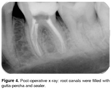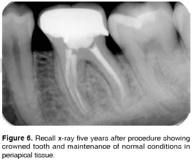 One of the main concerns in endodontic practice while using rotary NiTi instruments is the occurrence of separation. Reasons for file breakage include operator ability, preparation technique, improper use and overuse of the instrument, minute cracks inherent in the new instrument and root canal anatomy.8 When instrument separation occurs, the patient must be informed about the incident and proper documentation should be placed in his/her record for ethical and legal reasons. Although separated instruments in root canals do not always result in an unfavorable prognosis, instrument fractures prevent the removal of vital or non-vital pulp tissue which can lead to inflammation or infection.9 Considerations should be given to whether or not to remove the fragment either surgically or non surgically. Retrieving an instrument fragment in a canal may cause the excessive removal of dentin structure, decrease root strength, and even root perforation.6,7 Moreover, the success rate of removing the separated instruments in root canals mainly depends on the location of fractured segments and the degree of canal curvature.6,10 Alternatively, there is evidence obtained from systematic review and meta-analysis data from specialized practices and well-controlled university clinics5 which indicate that the prognosis for endodontic treatment when a fractured instrument fragment is left within a root canal is not significantly reduced. The prognosis is poorer if periapical lesions are present at the time of treatment, but only to the extent that effective canal disinfection is compromised. An important finding from this clinical case report was the absence of a preoperative periapical lesion, which served as the main prognostic factor for the successful management of such cases. After instruments breakage occurred in the tooth presented in this paper, decision of leaving the fractured instruments in the canals was made on the basis of diagnosis of symptomatic irreversible pulpitis and symptomatic apical periodontitis. Efforts to decrease failure risks were made after the accident, such as cleansing areas located in an area coronary with respect to the object cleaning and shaping according to standard endodontic procedures in order to incorporate it into the final root canal filling under copious irrigation with sodium hypochlorite, and 15% EDTA used for chelation. Nevertheless, avoidance of the problem is the best approach and clinicians should be proactive in instrumentation technique.11 In the present study, the ProTaper Universal System (Dentsply Maillefer, Ballaigues, Switzerland) was used in biomechanical preparation due their properties during root canal cleaning and shaping. These instruments consist of three shaping files (SX, S1, and S2) three finishing files (F1, F2, and F3) and two accessory finishing files (F4 and F5). These rotary NiTi files have been designed with gradually increasing taper over the length of their cutting blades, allowing each instrument to prepare a specific area of the canal. According to the manufacturer, the progressively tapered instrument system design, is supposed to increase the flexibility, and decrease torsional loads, instrument fatigue, and potential breakage.12 A recent cohort clinical study indicated that the incidence of file separation for the ProTaper rotary instruments was 2.4% and that these instruments may be safely reused clinically for at least four times.13 There are also reports in scientific literature suggesting that ProTaper F3 Instruments are highly susceptible to cyclic fatigue failure and should be reused with caution irrespectively of whether they were initially used for shaping straight or curved canals.14 Despite the fact that fracture of rotary NiTi files is a recognized complication in endodontics, the low incidence of these events supports their continued use during root canal instrumentation.15 To date, the best available evidence regarding prognosis of retained fractured instruments is from studies of case series, which offer a low level of evidence. Only two true case-control investigations were identified16,17 conducted 35 years apart, therefore, wide variations in clinical technique could be assumed. Treatment outcomes, however, have not changed significantly during the past several decades.18 Therefore, from a biologic standpoint, meta-analysis of these two studies seems justified. Case-control studies realistically and ethically provide the highest level of evidence possible in such investigations. Finally, as it was suggested in this report, it is necessary to organize appropriate follow-up of the patient in the event of any clinical complication. This allows periodic review and radiographic assessment to anticipate and deal with any potential problems. If deterioration of periapical health is detected, apical surgery or extraction should be considered.19 The follow-up radiographic exam of a case of mandibular molar with two separated endodontic rotary instruments in the mesiobuccal and mesiolingual canal respectively, at one, three and five years in the clinical case reported in this paper, showed the maintenance of the normal circumstances of tissue surrounding the root and a symptom- free patient with a restored tooth that did not adversely affect the outcome of root canal treatment.