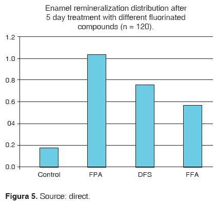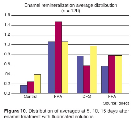 Even though no differences were observed between APF and FNa during the experimental period, SAF did show different behavior at 5 and 10 days of treatment. Nevertheless, when reaching 15 days after treatment, behavior of all groups was similar. This could be due to a saturation of the medium where SAF acts, which is not necessarily negative if we take into consideration the fact that continuous and prolonged applications can elicit negative effects such as fluorosis.35