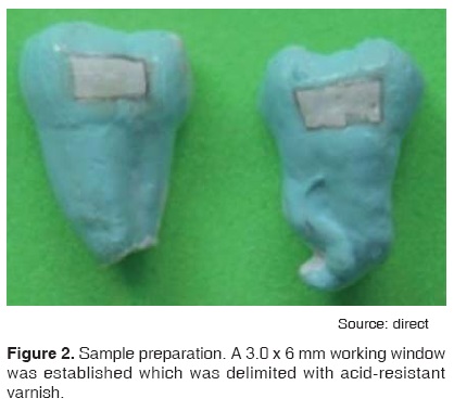 120 third molars were included in the sample. Molars had to comply with established participation criteria: (healthy, not erupted, with crown integrity and lacking visible structural defects in the enamel. Teeth were prepared following the method described by Klein and his group.22 This method is now briefly described: root soft tissue was removed, and prophylaxis was performed23 with fluoride-free prophylactic paste (QOM, Mexico). Molars were then sectioned24 with a diamond disk (Allied High Tech Products, USA) in a mesio-distal direction and at the longitudinal axis, under constant irrigation. All specimens were coated with acid-resistant varnish (Revlon, France), with the exception of one area, measuring 3.0 x 6.0 mm, located at the labial or lingual surface (Figure 2).