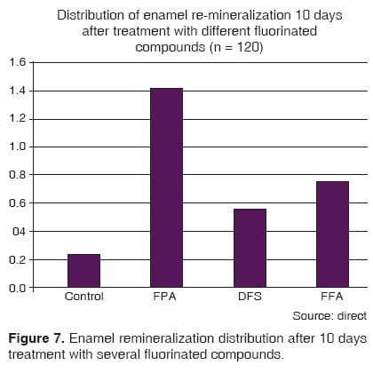 Among tested fluorinated compounds APF and DFS have been widely studied and their results are well known. Nevertheless, reports on SAF are scant in scientific literature. This is a product considered as a resource to arrest caries progression in pedodontics as well as medication to be used within the canals in endodontic treatments. With the exception of reports submitted by Dr Chu and his group,33 there is no information with respect to comparison between SAF and FNa.