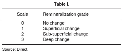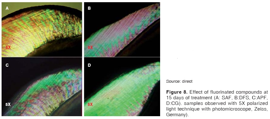 Determination of the effect exerted by fluoride-containing materials on the enamel was assessed through observation of samples. To this effect, an Axiophot Photomicroscope was used, with 5x and 10x work objectives, following the polarized light and grey and blue light filters technique. Means used for birefringence were deionized water and Tholuet solutions with 1.41 and 1.47 refraction indexes (RI). Individual photographic records were obtained and birefringence changes were assessed.8,22,26-28