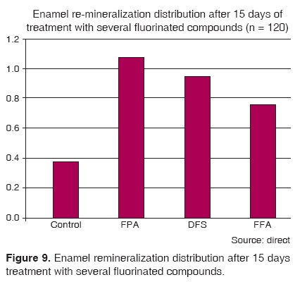 In the present work, SAF exhibited better performance on demineralized enamel than APF and FNa. This could be due to factors associated to high concentrations of F- (38%)34 and the great reactivity of F- with respect to the hydroxyapatite chemical structure, due to the substitution of functional OH- groups for F-.