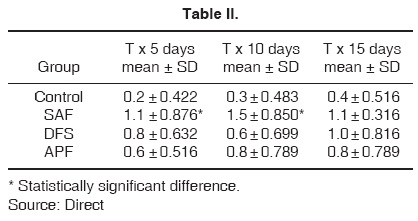 Specimens treated with SAF at 5, 10 and 15 days showed a mean of 1.1 ± 0.876, 1.5 ± 0.850 and 1.1 ± 0.316, respectively. These figures indicated that the highest values were obtained 10 days after treatment initiation. Nevertheless, no statistically significant difference could be established in samples included in this group (p = 0.401).