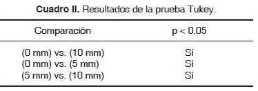 El grupo que fue fotocurado a 0 mm registró un promedio de profundidad de curado de 2.014 mm (D.E. 0.113) (Cuadro I), mientras que el grupo a 10 mm fue el que menor profundidad de curado presentó con 1.623 mm (D.E. 0.0847) (Figura 8).
