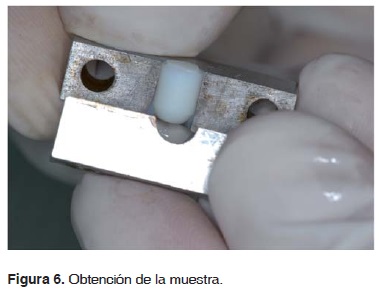 Para llevar a cabo la prueba de profundidad de curado se siguió la especificación No. 27 de la ADA; se utilizó un vidrio de 20 mm por 20 mm de 2 mm de grosor, sobre el cual se colocó un molde hacedor de muestras (con el que se obtuvieron muestras de 4 mm de diámetro y 6 mm de longitud).