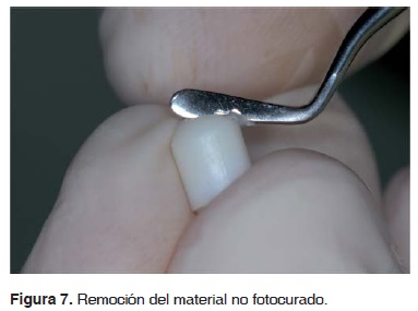 Una vez terminado el proceso de fotocurado, cada espécimen fue retirado del hacedor de muestras y el material no polimerizado se retiró con una espátula para resinas (Suter Dental®) (Figuras 2 a 7) (3, 4, 5, 6).