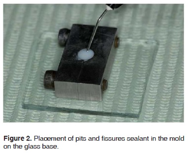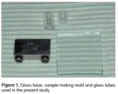 Specification number 27 of the American Dental Association (ADA) was followed: a 20 mm x 20 mm, 2 mm thick glass was used. On it, a sample-making mold was placed (with it, 4 mm diameter and 6 mm long samples were obtained). In order to preserve distance between pits and fissure sealant surface and light source, a 5 mm long and 6 mm diameter glass tube was used. The tube was of 10 mm length and 6 mm diameter (Figure 1). Polymerization depth was measured in 90 pits and fissures specimens.