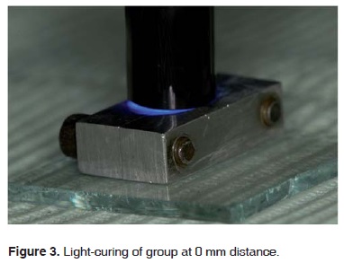 Specimens were assembled into three groups (30 specimens per group). One group was light-cured by placing the lamp directly upon the sealant's surface; another group was light-cured at a controlled 5 mm distance, by placing the lamp on the 5 mm long glass tube, and the last group was light-cured at a 10 mm controlled distance by placing the lamp on the 10 mm long glass tube. All specimens were light-cured for 20 seconds, following manufacturer's instructions.