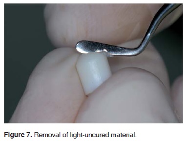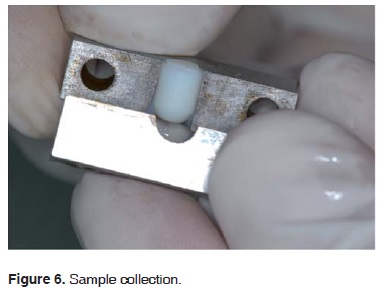 Once the light-curing process was completed, specimens were removed from the sample-maker and non-polymerized material was removed with a spatula for resin (Suter Dental®) (Figures 2 to 7)(3, 4, 5, 6).
