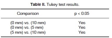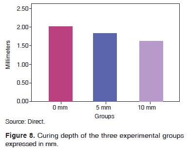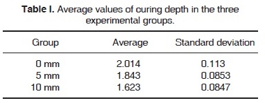 The group light-cured at 0 mm recorded a 2.014 mm curing depth average (SD0.113) (Table I), whereas the 10 mm group with 1.623 mm (SD 0.0847) presented the least curing depth (Figure 8). Statistically significant differences were found in average values when comparing the three groups to a p < 0.05 (Tukey) test (Table II).