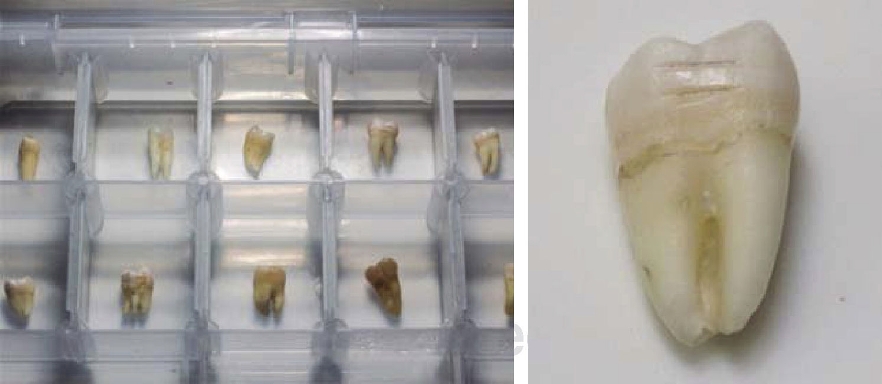 30 recently extracted teeth were selected. Teeth were free of caries or discoloration. When necessary all calculi were removed from all teeth with the use of an ultrasonic bath. All specimens were subjected to pumice prophylaxis in order to remove impurities.