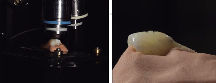 Figure 2 Placement of specimens on Raman spectrometer. Left panel shows 50x magnifying lens used in the microscope to locate the laser beam on the specimen. Right panel shows adhesion of plastic clay molding paste to the specimen.