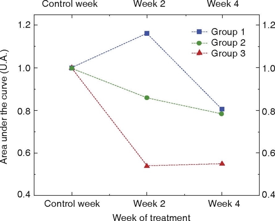 Based on this graph it can be observed that the second and third experimental groups presented a decrease of the studied molecule along all treatment weeks. It can be noted that the third experimental group has the sharpest decline at the second week of treatment, and that this decline stabilized when reaching the fourth week of treatment. When compared to group 3, group 2 exhibited a decline in concentration of phosphate molecule with a less marked slope. Contrary to the aforementioned, group 1 s the only one to present increase in phosphate molecule at mid-way in the treatment time. It must be equally noted that groups 1 and 2 reach a phosphate molecule loss similar to that occurring at 4th week of treatment. Therefore, based on the previously shown graph, it can be inferred that experimental groups 1 and 2 lose approximately 20% of phosphate molecule and group 3 loses approximately 50%.