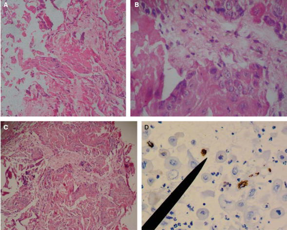 Case 1: a 45 year old male sought treatment for a tongue lesion of four month evolution. The patient did not report history of tobacco use, alcohol consumption or systemic conditions. Patient informed that algid area was located at the left hemi-mandibular region, with ipsilateral adenopathy centered at the submaxillary triangle of this area. Intra-oral examination revealed a mass in the left lateral anterior border of the lingual mucosa, the mass was papular, of whitish hue, oval-shaped, with slightly circumscribed borders, measuring 38 x 25 mm. Greyish reticulated foci could be observed in the described mucosa. Incisional biopsy was conducted at the central area of the lesion. Figures 1A-D show histopathological findings.