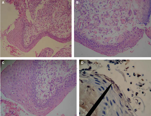 Case 2: a 62 year old male patient sought treatment for a tongue lesion of two and a half month evolution. The patient reported no tobacco consumption habit but habitual alcohol intake. As pathological history he reported high blood pressure. Intraoral examination revealed an opaque, whitish, papular lesion; the lesion was homogeneously flat, of irregular shape, with leukoplastic aspect, circumscribed borders, measured 29 x 14 mm and was located at the right lateral border of the tongue. Surgical description reported a 5 mm3 incisional biopsy. Figures 2A-D show histopathological and immunohistochemical findings.