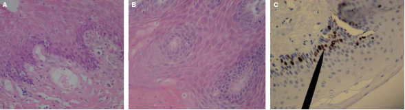 Figure 3 Histological pictures of OSCC with H&E. A) 10x objective revealed thickened hyperplastic epithelium infiltrated towards the lamina propria. B) 40x objective reveals lingual epithelium squamous stratum with dysplastic foci, where mega to microkaryotic keratinocytes can be observed, with chromatin predominance. C) 40x objective: the marker shows moderate positive immunohistochemistry for Ki-67 in kerantinocytes of spinous and basal stratum, negative for cyclin D1.