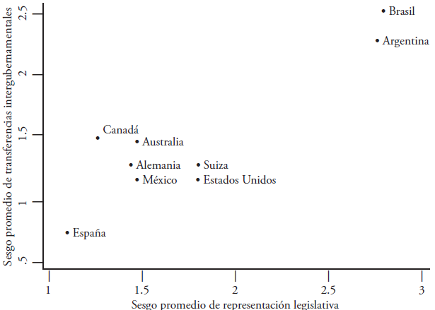 La gráfica 1 muestra la relación entre el sesgo promedio entre unidades subnacionales (estados, provincias, regiones) en la representación legislativa y el sesgo promedio en la distribución de transferencias a esas unidades en las nueve federaciones analizadas en el estudio citado de Dragu y Rodden (2011). Como puede observarse, los casos que mejor se ajustan a las predicciones de la hipótesis del sesgo en la representación son España, México, Estados Unidos, Suiza, Brasil y Argentina. Entre estas seis federaciones, los tres países latinoamericanos constituyen casos que dentro de una misma región ofrecen amplia variación en cuanto al nivel de sesgo en ambas variables, representación legislativa y distribución de recursos. Brasil y Argentina se ubican en un nivel extremo de sesgo dentro del universo de federaciones consideradas, y México muestra un nivel bajo, por debajo de la media en ambas dimensiones.