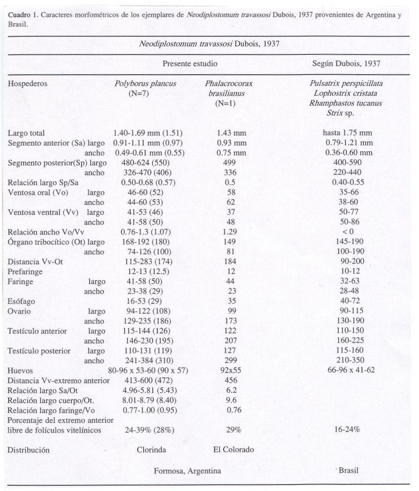 De la comparación de nuestros ejemplares con los representantes neotropicales, surge que todos presentan las glándulas vitelógenas en el segmento anterior, distribuidas por delante de la ventosa ventral; sin embargo, en N. ellipticum ellipticum, N. centuri, N. fastigatum y N. conicum, los folículos vitelógenos se distribuyen ampliamente, dejando libre sólo la región faríngea, la esofágica o el sector de la bifurcación intestinal. Contrariamente, en N. isomegalocotyle presentan una distribución más restringida al extenderse escasamente por delante de la ventosa ventral. En las especies restantes (N. microcotyle, N. biovatum y N. travassosi) los folículos presentan un rango intermedio en su distribución, similar al exhibido por nuestro material. Sin embargo, N. biovatum difiere por ser de menor tamaño y poseer ventosas y huevos más pequeños (miden hasta 0.93 mm de largo; segmento anterior 0.37-0.53 por 0.26- 0.32 mm; segmento posterior 0.32-0.40 por 0.25- 0.31 mm; ventosa oral 36-40 por 36-43; ventosa ventral 31-36 por 31-41; huevos 63-79 por 33-43). Neodiplostomum microcotyle se distingue por presentar los segmentos poco diferenciados y el órgano tribocítico de mayor tamaño (200-250 por 140-210), característica que se traduce en un valor menor de la relación largo segmento anterior / largo órgano tribocítico (3.24-4.17). Contrariamente, los representantes de N. travassosi son morfológica y morfométricamente similares a los colectados de P. plancus y P. brasilianus (Cuadro 1). Esta especie fue descrita parasitando el intestino de Pulsatrix perspicillata (Lath.), Lophostrix cristata (Daud.), Strix sp. y Rhamphastos tucanus L. y su diagnosis original, transcrita por Travassos et al. (1969).