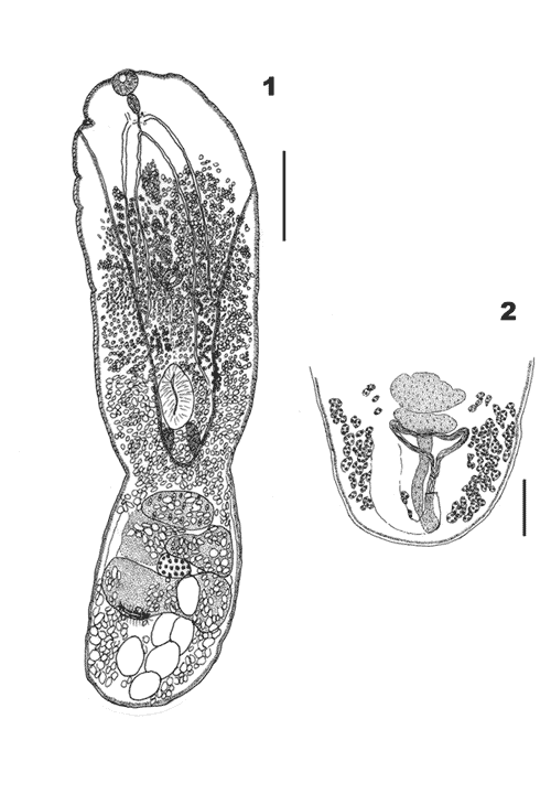 Figura 1. Neodiplostomum travassosi Dubois, 1937. 1. Ejemplar in toto, vista ventral. Escala= 200 µm. 2. Detalle de la genitalia terminal, vista dorsal. Escala= 100 µm.