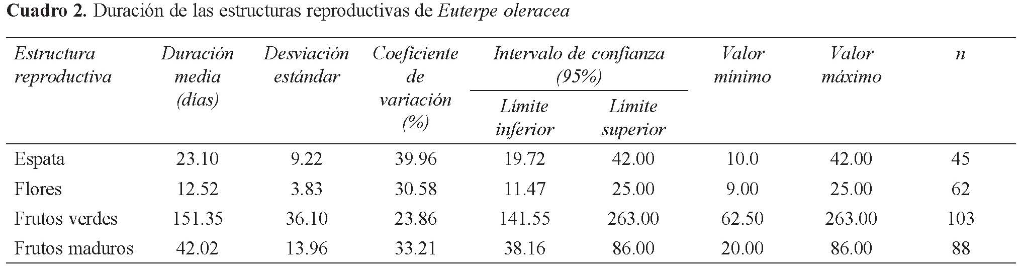La duración de cada estructura reproductiva fue variable. El tiempo medio de permanencia de la espata, desde su aparición hasta que se rompe y expone las flores, fue 23.10 días (desviación estándar DE= 9.22); para la fenofase flores, fue 12.52 días (DE= 3.83). Los frutos verdes tuvieron una duración media de 151.35 días (DE= 36.10), mientras que la duración de los frutos maduros fue 42.02 días (DE= 13.96). El tiempo transcurrido desde la aparición de una espata hasta la maduración y caída de sus frutos fue, en promedio, 228.9 días (Cuadro 2).