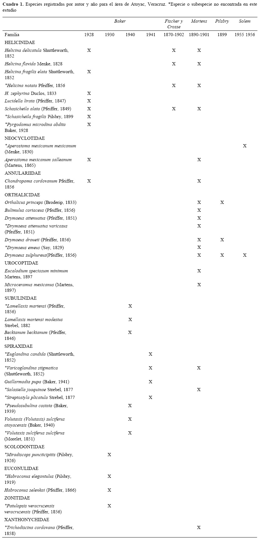 En el área de Atoyac, Veracruz se habían registrado un total de 37 especies de gasterópodos terrestres en los trabajos de Fischer y Crosse (1870-1902), Martens (1890-1901), Baker (1928, 1930, 1940, 1941) y Solem (1955, 1956). Las especies registradas en dichos trabajos son macromoluscos con excepción de Miradiscops puncticipitis, Habroconus elegantulus y H. selenkai (Cuadro 1). En el municipio de Atoyac se exploraron 21 localidades donde se encontró casi el doble de gasterópodos terrestres registrados con anterioridad en el área; además, se registran posibles nuevas especies pertenecientes a los géneros Leptinaria, Cecilioides y Pallifera.