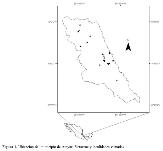 La sierra de Atoyac se encuentra ubicada en la zona central y montañosa del estado de Veracruz (Fig. 1; 18°55' N, 96°46' O). Está constituida por cerros de topografía cárstica y posee una altitud que varía de los 350 a los 950 m (Acevedo y Castillo, 1987). Chiang (1970) registró para esta zona encinar de Quercus oleoides y selva mediana subperennifolia de Brosimum alicastrum. De las observaciones realizadas en el campo es evidente que la vegetación ha sido modificada, en la actualidad encontramos plantaciones de caña, café, plátano y limón.