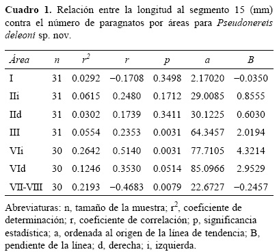Pseudonereis variegata presenta área II= 13-34 paragnatos, III= 59-76 paragnatos y IV= 63-87 paragnatos; espinígero heterogonfo inicia alrededor del setígero 40; cirro dorsal 2 veces más largo que la lígula notopodal ventral; cirro dorsal terminal solo en los últimos setígeros y 4-5 dientes mandibulares. Mientras que P. deleoni sp. nov. presenta áreas II-IV con mayor número de paragnatos: área II= 29-41, III= 62-92 y IV= 88-118; espinígero heterogonfo surge a partir de los setígeros 21-25; cirro dorsal 4 veces la longitud de la lígula notopodal ventral; cirro dorsal terminal desde los setígeros 44-56 y 6-10 dientes mandibulares. El número de paragnatos no aumenta conforme incrementan de talla los ejemplares (Cuadro 1).