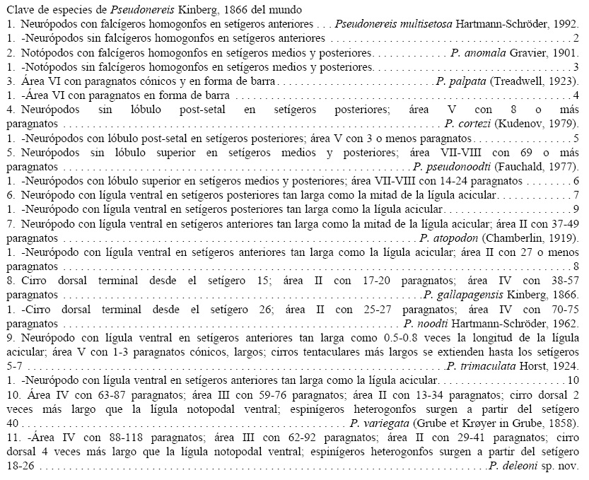 Comentarios taxonómicos. De las 4 especies de Pseudonereis registradas en las ecorregiones marinas mexicanas (ver clave para comparar con especies de otras regiones del mundo), solamente 2 pueden ser asignadas dentro de un grupo representado por la presencia de 1 o 2 paragnatos en las áreas I y V: Pseudonereis gallapagensis Kinberg, 1866 y P. variegata (Grube et Kreyer in Grube, 1858). Ambas especies se diferencian fácilmente por la longitud de la lígula neuropodal ventral y del cirro dorsal en setígeros posteriores, y por el número de paragnatos en el área IV. Pseudonereis gallapagensis presenta lígula neuropodal reducida (tan larga como la mitad de la lígula acicular), cirro dorsal 3 veces más largo que la lígula notopodal ventral y área IV con 38-57 paragnatos; mientras que en P. variegata, la lígula neuropodal ventral es desarrollada (tan larga como la lígula acicular neuropodal), el cirro dorsal es 2 veces más largo que la lígula notopodal ventral y el área IV con 68-87 paragnatos. Esta última especie fue descrita originalmente para Valparaíso (Chile) y Callao (Perú), ha sido registrada para varias localidades de los océanos Atlántico, Índico y Pacífico; por tanto, ha sido catalogada como una especie pantropical (Bastida-Zavala, 1993). No obstante, la revisión reciente sugiere una distribución anfiamericana (Sudamérica) (Bakken, 2007).