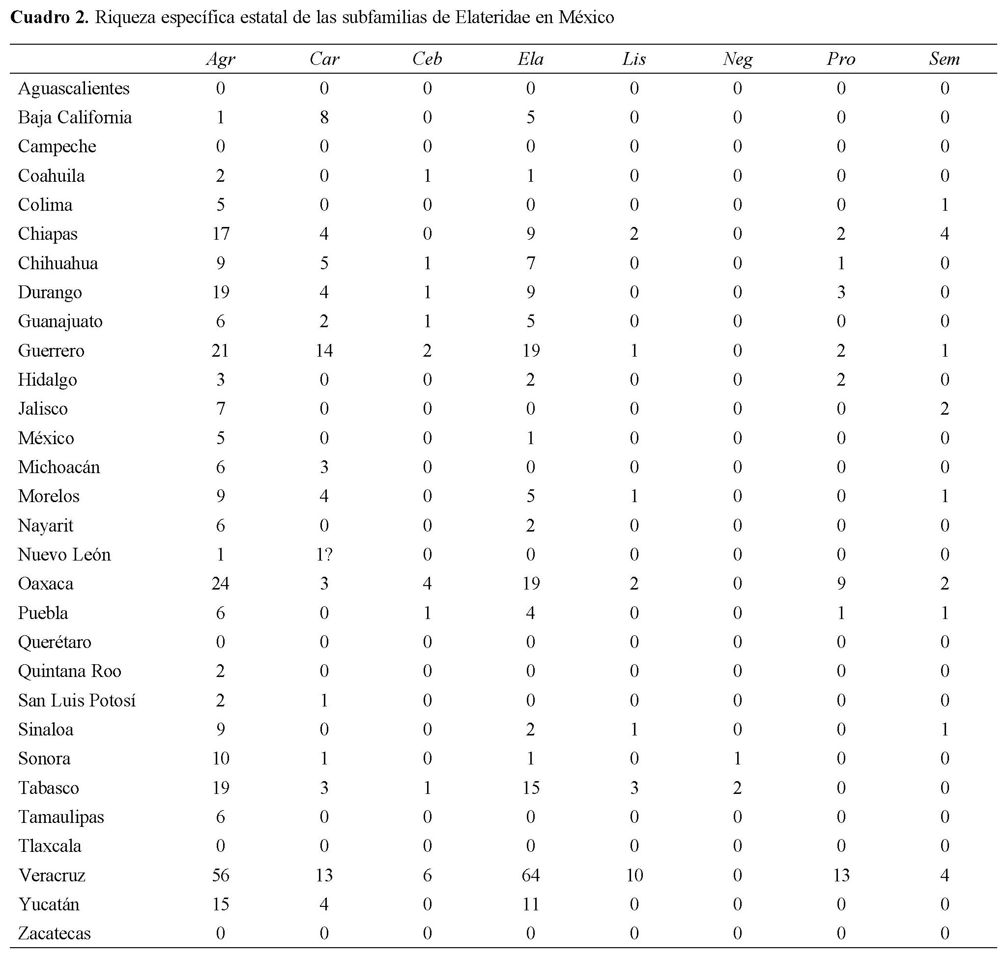 Riqueza. La riqueza estatal se concentra en pocos estados: Veracruz, Oaxaca, Tabasco, Chiapas y Durango con el 35.5%, 13.2%, 9.2%, 7.7% y 7.7%, respectivamente. Los estados sin registros son: Campeche, Tlaxcala, Querétaro y Zacatecas. Las subfamilias Agrypninae y Elaterinae tienen representantes en más de la mitad de los estados, lo que contrasta con la presencia en sólo 2 estados de especies de la subfamilia Negastrinae (Cuadro 2). Este patrón general de distribución no es muy diferente al de otras familias de escarabajos en México.