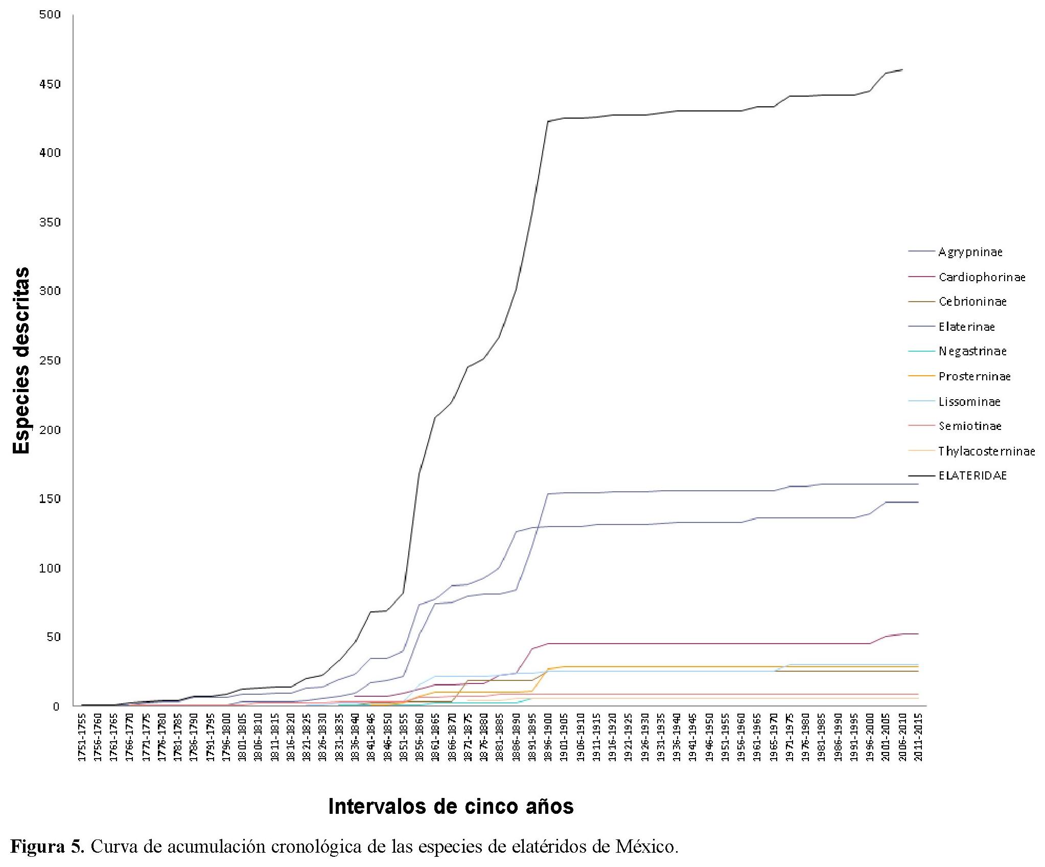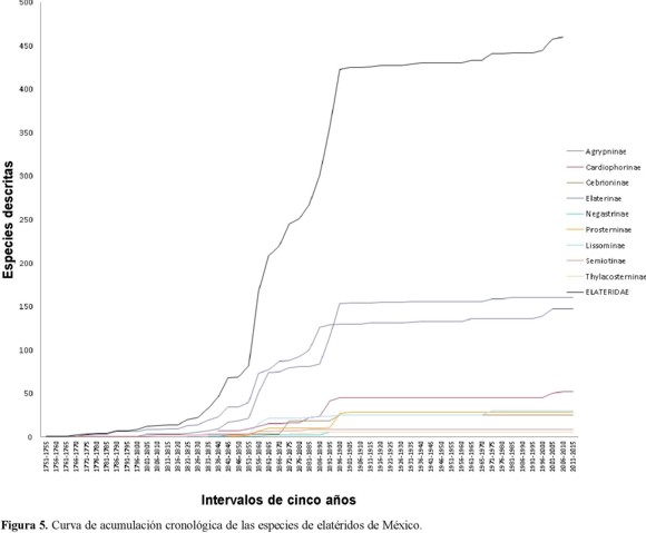 Desde que Linneaus (1758) hizo la primera descripción de un elatérido de México, varios especialistas han contribuido al conocimiento de los elatéridos en nuestro país. Dos de ellos destacan sobre los demás: Candèze y Champion (1895-1896) con 137 y 144 especies respectivamente; en otras palabras, ambos describieron poco más de la mitad de las especies mexicanas de eláteridos. Las aportaciones de Costa (1971, 1975, 1983), Casari (1996, 2002) y Aranda (2001) entre otros, son relativamente recientes. El desarrollo del conocimiento de elatéridos mexicanos se muestra en el cuadro 3.