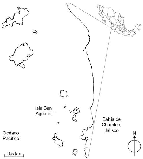 La isla San Agustín (ISA) se ubica a 0.45 km de la costa y a 1.9 km al noroeste del poblado de Chamela, municipio de La Huerta, Jalisco, México (19°32’05” N, 105°32’18” O; 15 m snm) (Fig. 1). En ISA, el bosque tropical caducifolio (BTC) es la vegetación predominante, aunque está menos estructurada y es de menor tamaño que el BTC en la zona continental adyacente (Conanp, 2008). En la región, la temperatura promedio anual es 25 °C y la precipitación promedio anual es de 749 mm que se concentra de julio a octubre (Bullock, 1986; Maass et al., 2017). En ISA se muestrearon 1,875 m2 divididos en 3 parcelas de 25 × 25 m, es decir, 5% de los 33,000 m2 que comprenden su área total.