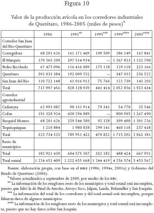 El crecimiento de esta rama ha sido constante en el conjunto de los municipios del corredor (véase figura 9), aunque de manera más sobresaliente desde la década de 1990 por la adopción del modelo de integración vertical de las compañías avícolas, en especial por la aparición de Pilgrim's Pride en el campo queretano en 1988.