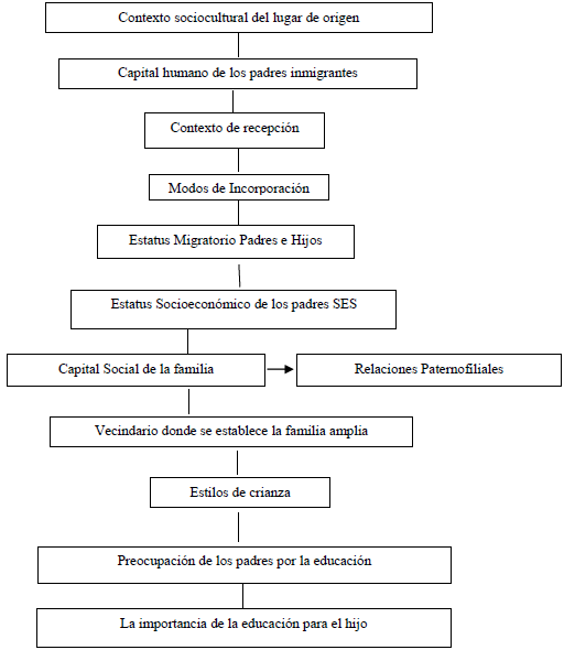 A pesar de las limitaciones de estas perspectivas teóricas que han intentado explicar la formación de las aspiraciones y el éxito educativo de los hijos de inmigrantes, han proporcionado una serie de elementos útiles que ayudan a explicar dicho proceso. Elementos que serán de gran utilidad para generar una propuesta de análisis para el caso de los hijos de inmigrantes mexicanos en Estados Unidos. Para ello, se propone combinar ambas perspectivas, agregando una serie de nuevos elementos tales como el contexto sociocultural del lugar de origen, las relaciones paternofiliales, los estilos de crianza, la preocupación de los padres por la educación y la importancia de la educación para el hijo. Estos elementos serán de gran relevancia para explicar el papel de la vida familiar en la formación de las aspiraciones educativas de los hijos de inmigrantes mexicanos en Estados Unidos. Dichos elementos son descritos en el esquema del Cuadro 2.