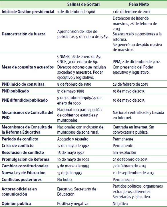 Para fines de la comparación que se busca hacer en éste artículo, se hace notar que en el sexenio de Salinas se hizo uso de la violencia con un gremio ajeno al educativo, se instalaron mesas de negociación, que incluyeron al SNTE, para elaborar la reforma y para la formulación de los instrumentos de política pública, en los cuales se involucró a los sectores sociales, empresarial y político. Las notas informativas señalan la realización de eventos en zonas rurales con apoyo de autoridades municipales. La instrumentación política se organizó de lo general a lo sectorial: PND-PSE-ANMEB. Las acciones para concluir la RE, con la promulgación de leyes, requirieron más de cuatro años de trabajo. Los conflictos, fueron resueltos mediante una mesa de negociación con la concurrencia de los afectados y previo a la publicación de la reforma. Posterior a los acuerdos tomados, no se presentaron problemas entre el sector educativo y el gobierno federal.
